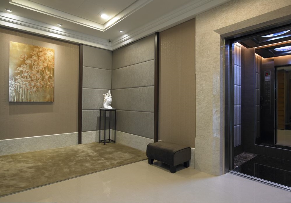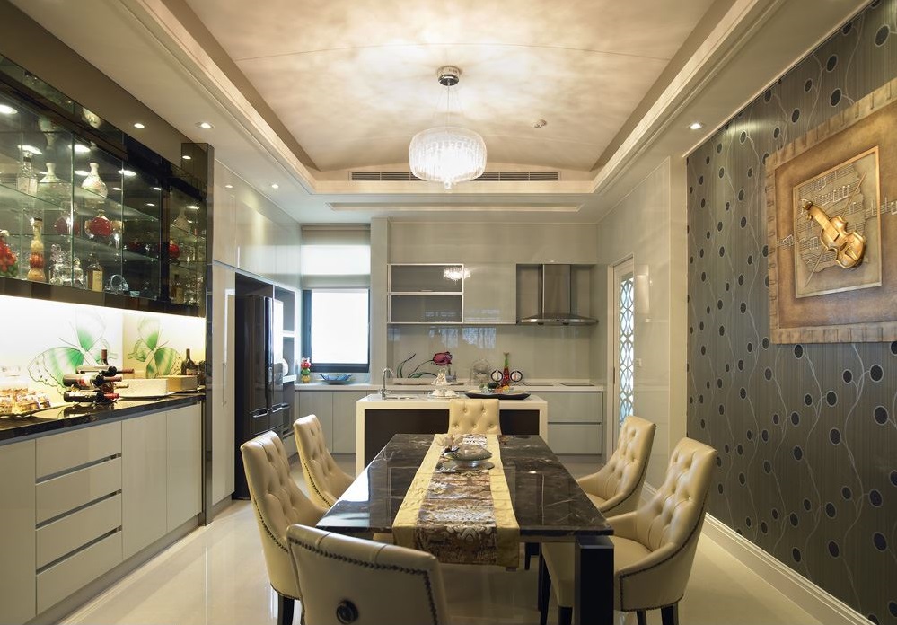 走進辦公室會客區,即可見醒目的金箔字畫,釋放出尊貴雍容的氣息,以“精進”二字傳遞企業文化形象,并透過木質格柵、內嵌臺面的展示收藏物與綠意植栽,妝點會客區的典雅中式氣息;在長型會議室內,則配置間接光源添加空間暖度,搭配墻面字畫及鳥籠掛飾等物,帶出藝術品味;搭乘電梯來到住家空間,設計師刻意裝置電梯做出領域切換,并設計一個充滿質感的玄關,做出寧靜的端景意象,宣告這里為不受干擾的私人居家領域開端;在客廳領域,透過米黃大理石電視墻搭配同色系的皮革沙發,展現色彩和諧的大器空間感,并點綴天花線板,妝點出新古典的居家層次;同時,以透明拉門彈性區隔客廳與餐廚領域,規劃出熱炒區及輕食區,打造出清爽不受干擾的餐廚氛圍;來到私領域主臥前,則會經過被視為過渡地帶的起居室,以造型拉門做兩者之間的界定,主臥則配置紅色床頭板,與紫色絨布床尾椅,創造寢臥中雍容且醒目的焦點色彩!