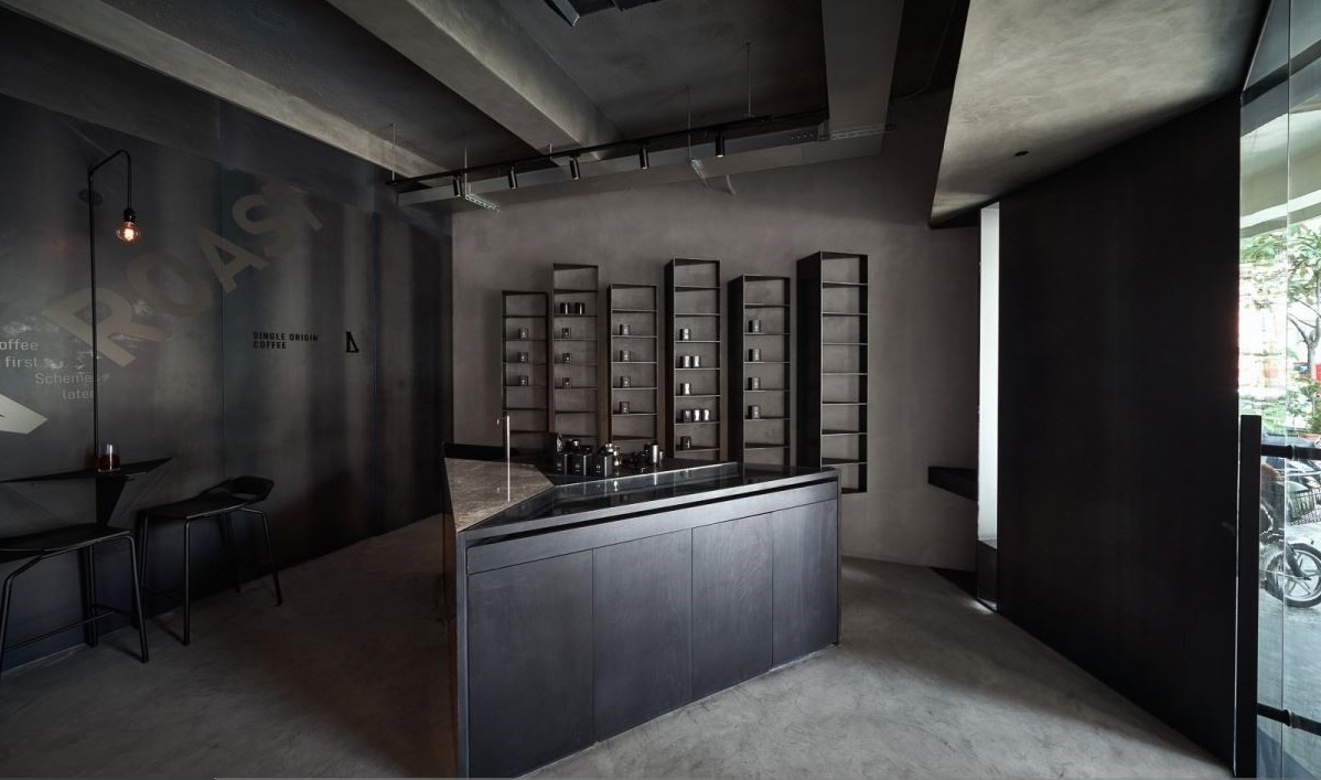 室內(nèi)以水泥作為天地壁的基底,搭配鐵件軌道燈、吊燈,以及靠墻處的小型座位,營(yíng)造出自然樸實(shí)的味道;三角形吧臺(tái)為空間核心,平臺(tái)利用石材、鐵件與玻璃材質(zhì)的銜接,串連煮咖啡、閱讀咖啡menu、收納咖啡杯的功能,靠近大門(mén)的位子還可拉出座位,讓客人能夠乘坐并欣賞老板手沖咖啡的樂(lè)趣;面對(duì)大門(mén)的壁面打造深色質(zhì)感主體墻,另一側(cè)墻面以三角形的鐵件層架安排,陳列著包裝好的咖啡豆與器皿,形塑精品般的簡(jiǎn)潔味道;室內(nèi)座位不多,靠墻搭建小小的三角形桌子,自桌面延伸出立體、線條感的簡(jiǎn)約立燈并搭配高腳椅,伴隨暈黃光感的映照下,醞釀慵懶、隨性的生活態(tài)度。