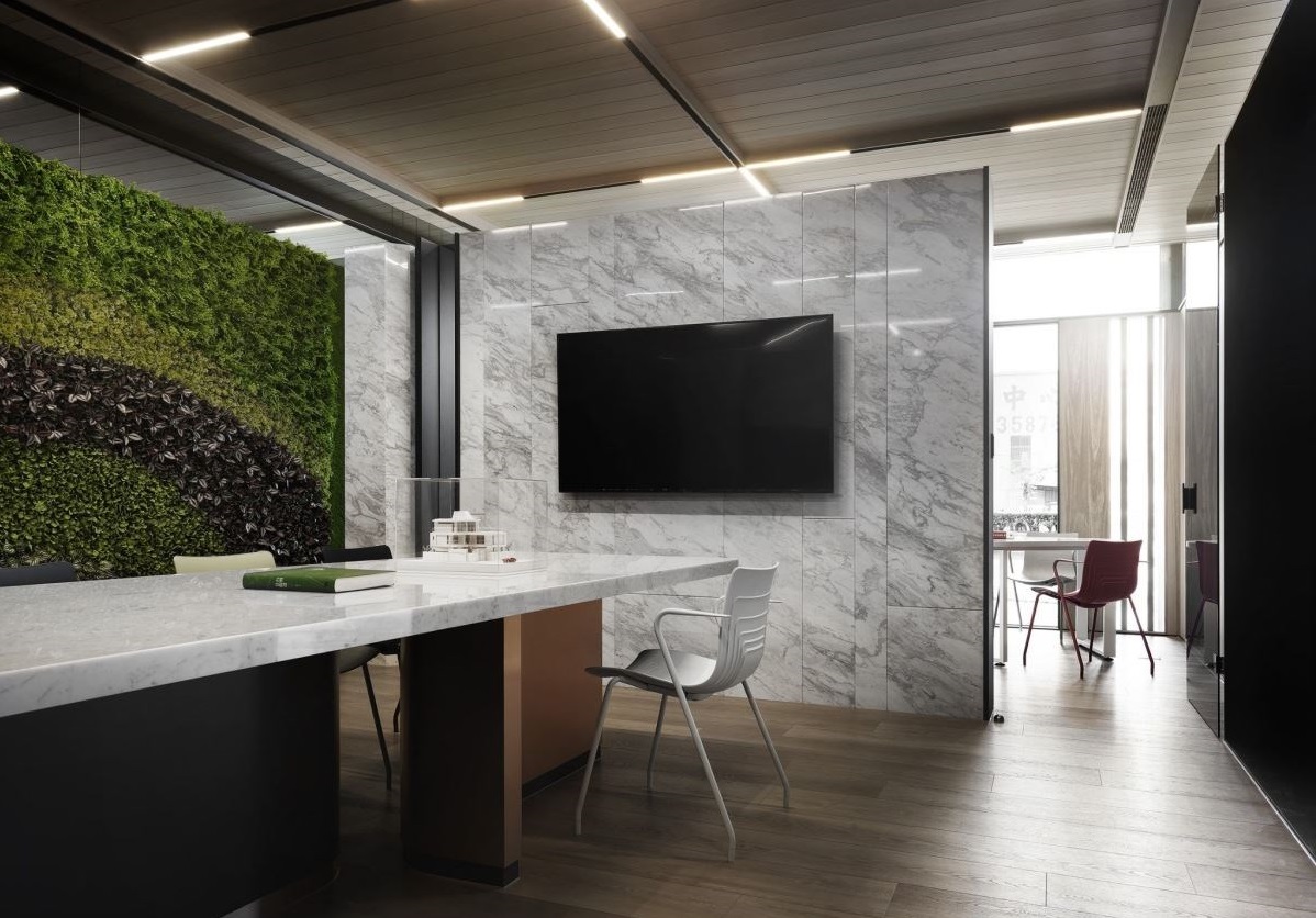 空間外觀上,循著細膩的木格柵入內,以深黑大理石揭開主題,透過不規則的幾何光影寫下一絲輕快的現代感,搭配清玻璃隱隱透出室內綠意,誘人想前往一探究竟。踏入室內,立面鋪陳大篇幅的綠植墻,創造會呼吸般的自然氣場,而端景墻、柜體與臺面,則以淺白大理石細細妝點,彰顯奢華卻不失質感的特性,照明設計則延續幾何線性的鋪排,利用不連續的特性一展時尚新潮的氛圍,打破一般對石材展示中心的想像。