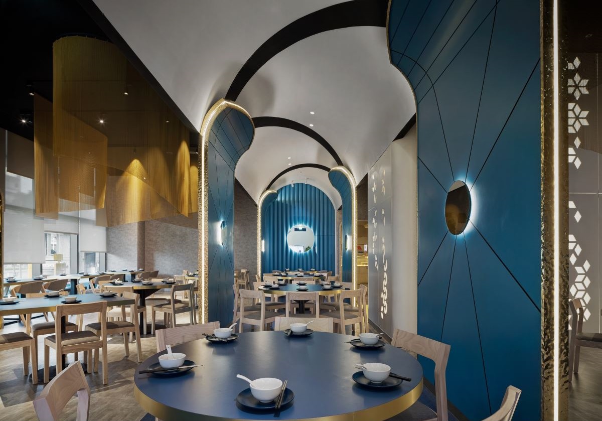 一樓餐飲,規劃半圓拱門玄關引導動線,搭配數位電子螢幕營造水瀑意象,形成迎賓的美好風景,以藍白色象征水流,讓顧客在室內也猶如置身自然美景之中;格局上,則借由挑空天花與大面積落地窗,營造壯闊大器的氛圍,規劃弧形天花延伸出至頂部開展成獨特造型;空間隔屏采藏青色為基底,加入金屬飾條、隱藏LED燈帶包覆,華貴且低奢,借由錯落配置劃出長條形的類動線廊道,適時為大尺度空間區分出左右兩個用餐區塊,與垂墜的金色金屬簾、圓形鏡面、鏤空板的幾何造型光暈,共構出具儀式感的視覺主軸!