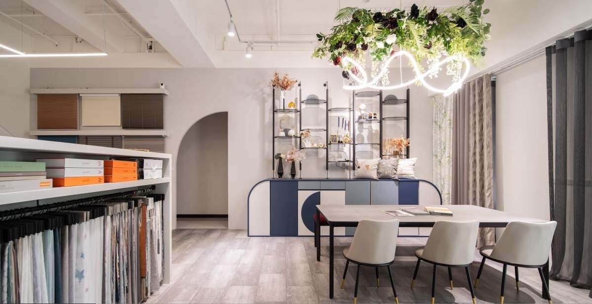 設計師利用櫥窗區域,來展現品牌的軟裝布置專長,透過墻面的幾何鹿頭圖騰,以及窗簾與花藝的妝點,營造出吸睛的藝術構圖,再加上后方的植生墻背景,成功賦予了豐富的視覺景深。