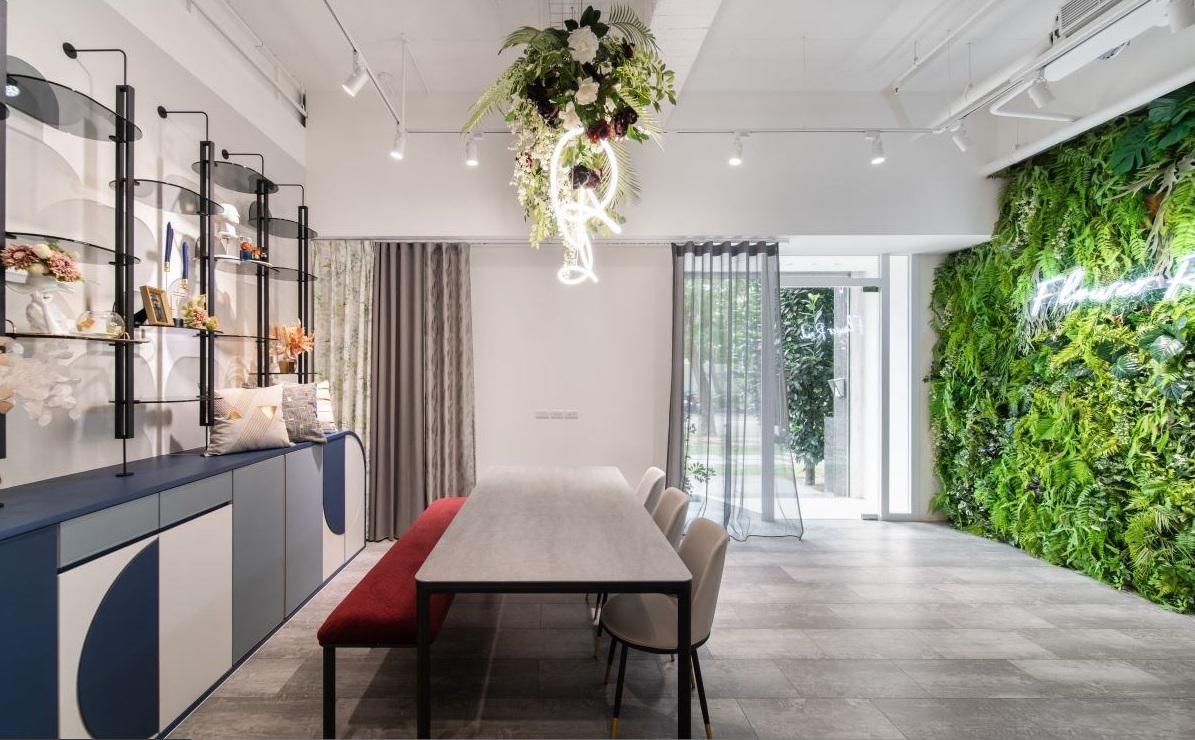 設計師在空間內特別規劃一面綠意盎然的植生墻,結合浪漫風情的質感吊椅,塑造令人心生向往的網美打卡墻。會客桌上方的花藝垂墜而下,呼應著植生墻的自然氣質,又點出該品牌的核心服務之一,形成優雅的空間景致。一旁展示柜融入 Pantone 經典藍、橢圓形層板和半圓門片造型等元素,借由細膩的修飾技巧,表現空間的柔和美感。